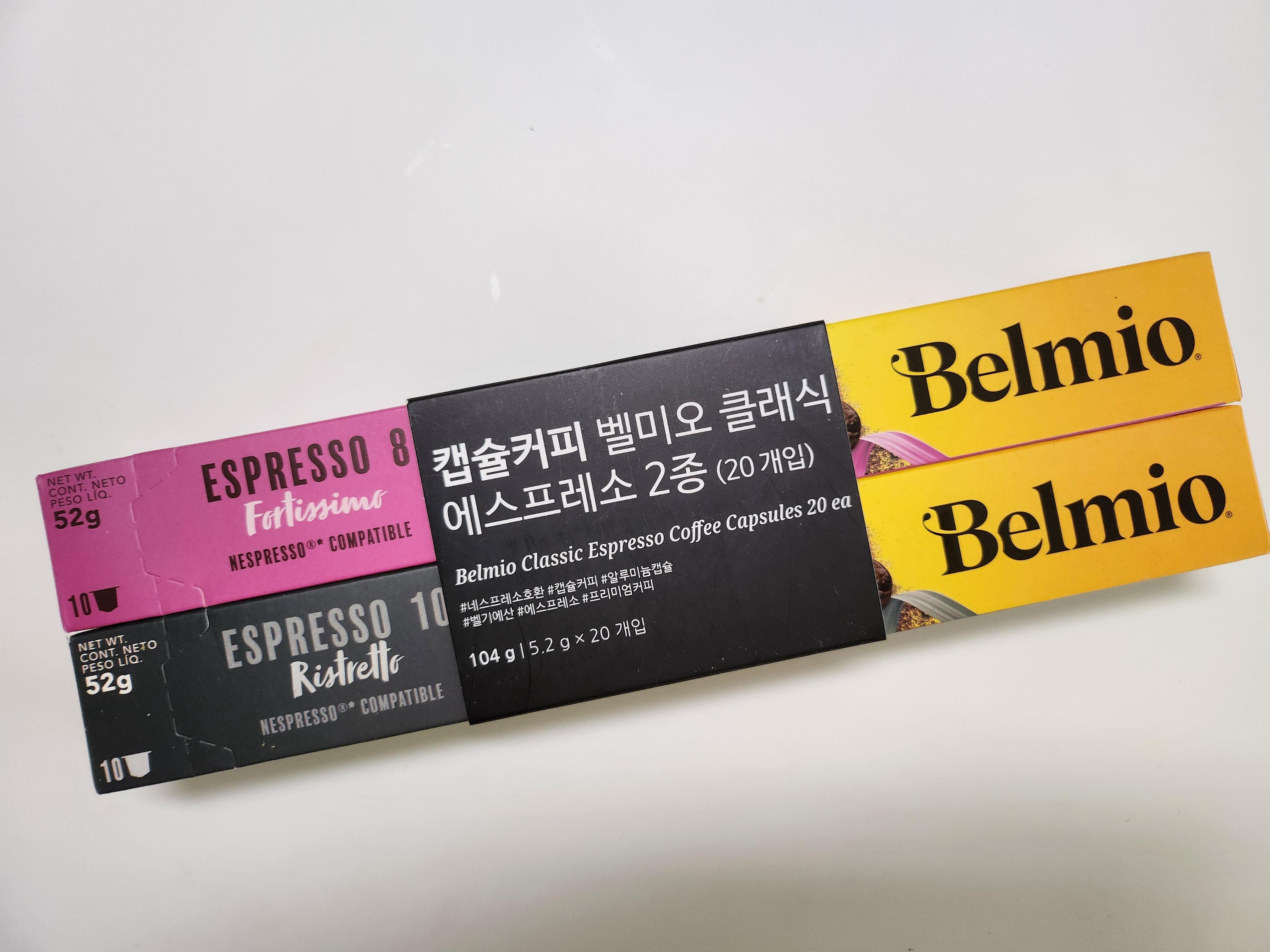 바닐라향이 첨가된 다른 캡슐도 있었지만 저는 클래식한 것을 좋아하는 편이라 벨미오 클래식 에스프레소 2종으로 가볍게 구입하였습니다. 노브랜드에 커피캡슐도 판매하고 좋네요.